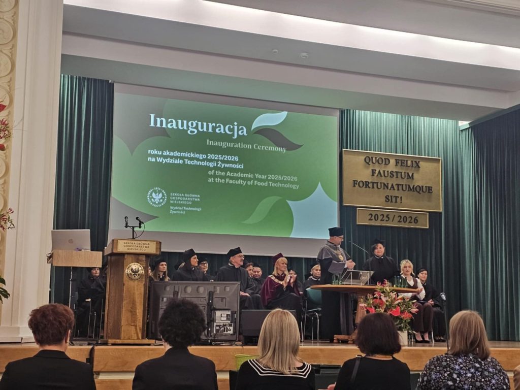 1 października odbyła się uroczysta inauguracja roku akademickiego 2025/2026 – wydarzenie, które jak co roku zgromadziło społeczność akademicką naszego Wydziału i stało się okazją do wspólnego świętowania oraz refleksji nad misją i wartościami, jakie niesie ze sobą nauka i kształcenie studentów. Uroczystość rozpoczęły wystąpienia władz: Dziekana, dr. hab. Rafała Wołosiaka, prof. SGGW, Prorektor ds. umiędzynarodowienia, dr hab. Marty Mendel, prof. SGGW, reprezentującej Władze Rektorskie, a także Dyrektora Instytutu Nauk o Żywności, prof. dr hab. Mirosława Słowińskiego, który przypomniał o roli, jaką pełni nasz wydział w kształtowaniu przyszłych pokoleń specjalistów i naukowców. Głos zabrała również Przewodnicząca Rady Wydziałowej Samorządu Studentów, Julia Kmita, przekazując słowa otuchy i inspiracji swoim kolegom i koleżankom.